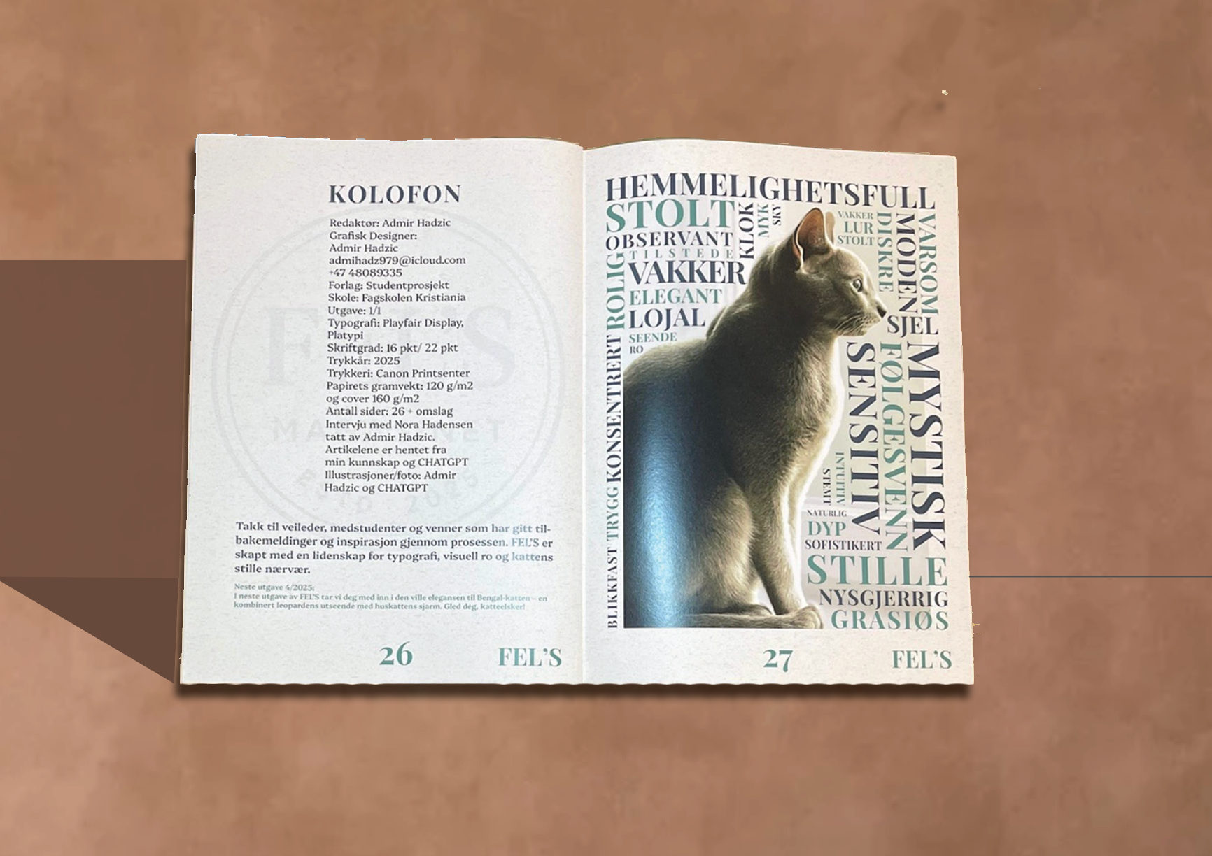 FEL’S er et 28-siders magasin i fysisk format, dedikert til den russiske blå katten. Designet kombinerer typografi, illustrasjon og grafisk layout med fokus på eleganse og ro. Trykket på lett teksturert papir i 21 × 29,7 cm gir magasinet et eksklusivt preg. Med bruk av grid, fargepalett og Libre Franklin typografi oppnås en helhetlig stil, der formidlingen styrkes gjennom både design og produksjonskvalitet.